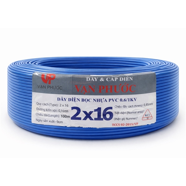 Dây điện bọc nhựa PVC 2×16 của Vạn Phước là loại dây điện dân dụng – kỹ thuật, gồm 2 lõi dẫn, cách điện PVC, sử dụng cho các hệ thống điện nhẹ và mạch điều khiển trong nhà. Sản phẩm được đóng cuộn 100m, phù hợp cho thi công, sửa chữa và lắp đặt điện cơ bản.